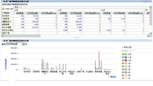如下圖—各月廠商采購情況及排名分析:將要考察的信息(如:采購數(shù)量、采購金額)納入,并加入廠商維度,形成各廠商采購分析情況,透過“排名”公式,就可以快速實現(xiàn)廠商的采購情況和排名情況分析。